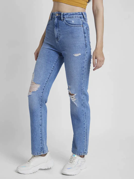Manufacturer of International OEM Brands-Custom Made tapered European and American trend Street Fashionable Jeans Stretch, Straight Fit Regular Length Mild Distressed Denim Jeans for Women