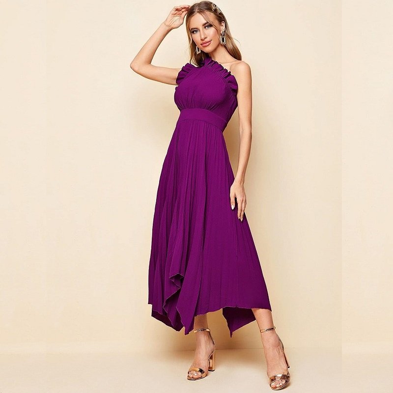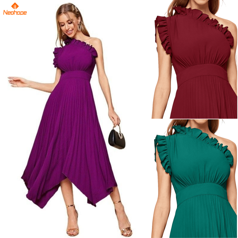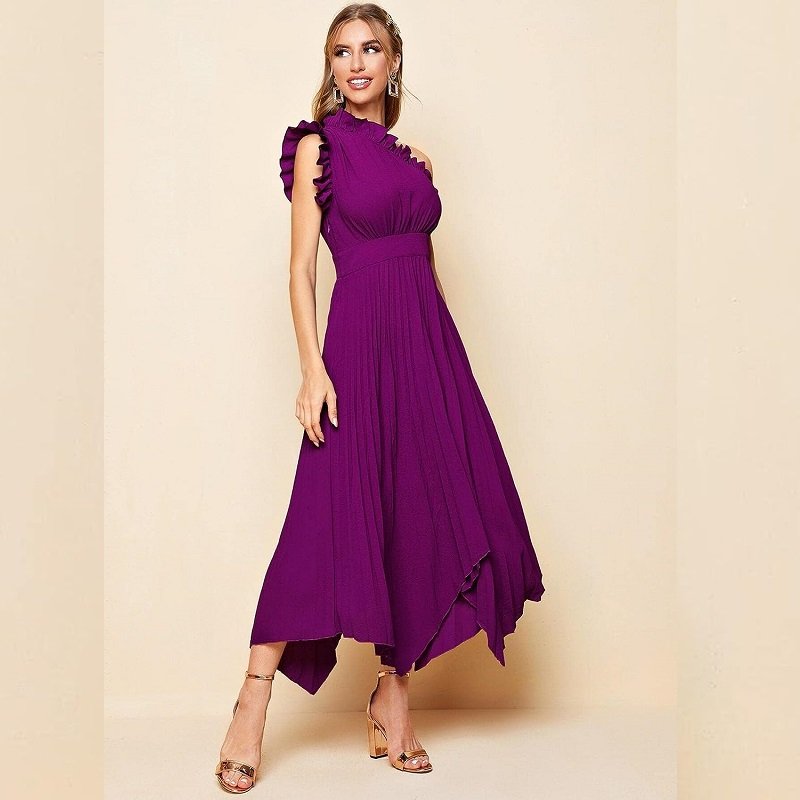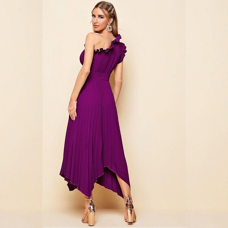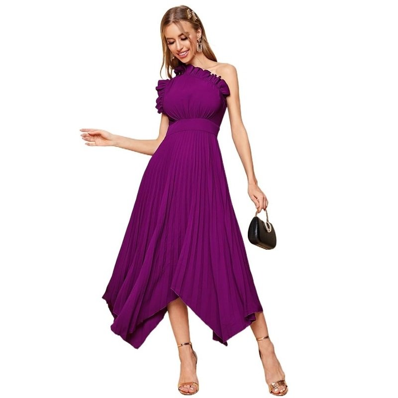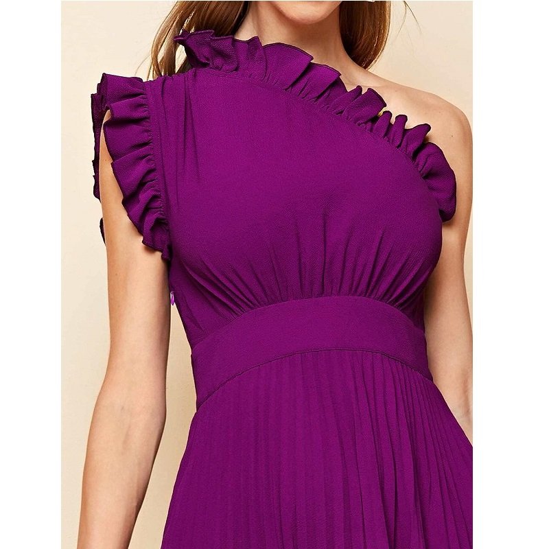 Women’s Dresses One Shoulder Ruffle Detail Pleated Hanky Hem Dress Summer Homecoming Dress for Women (Color : Purple)