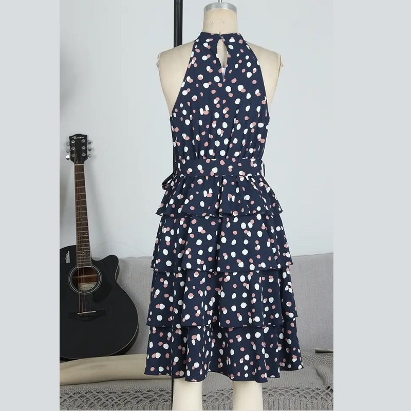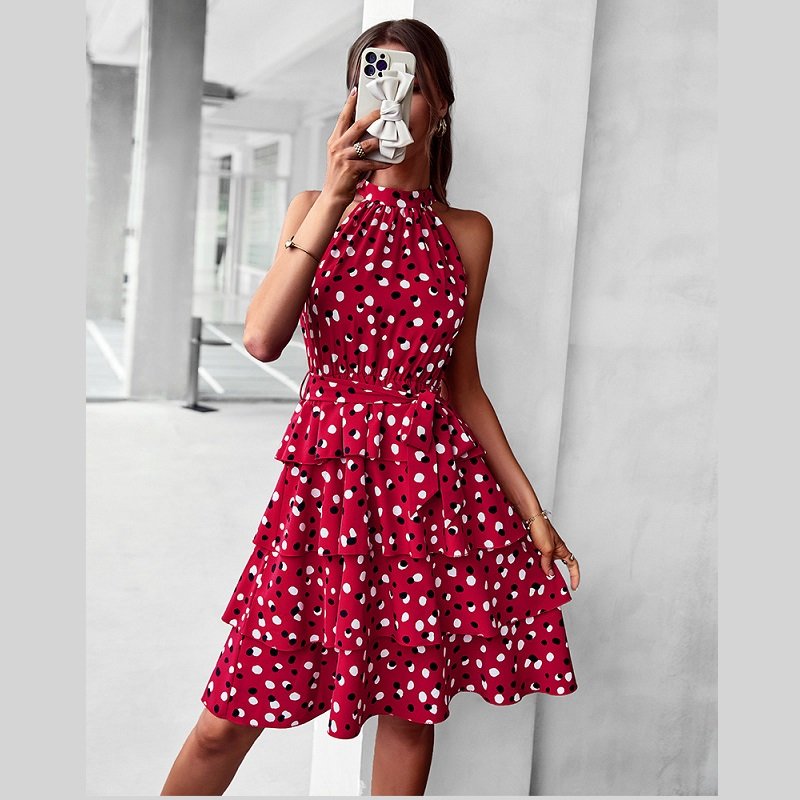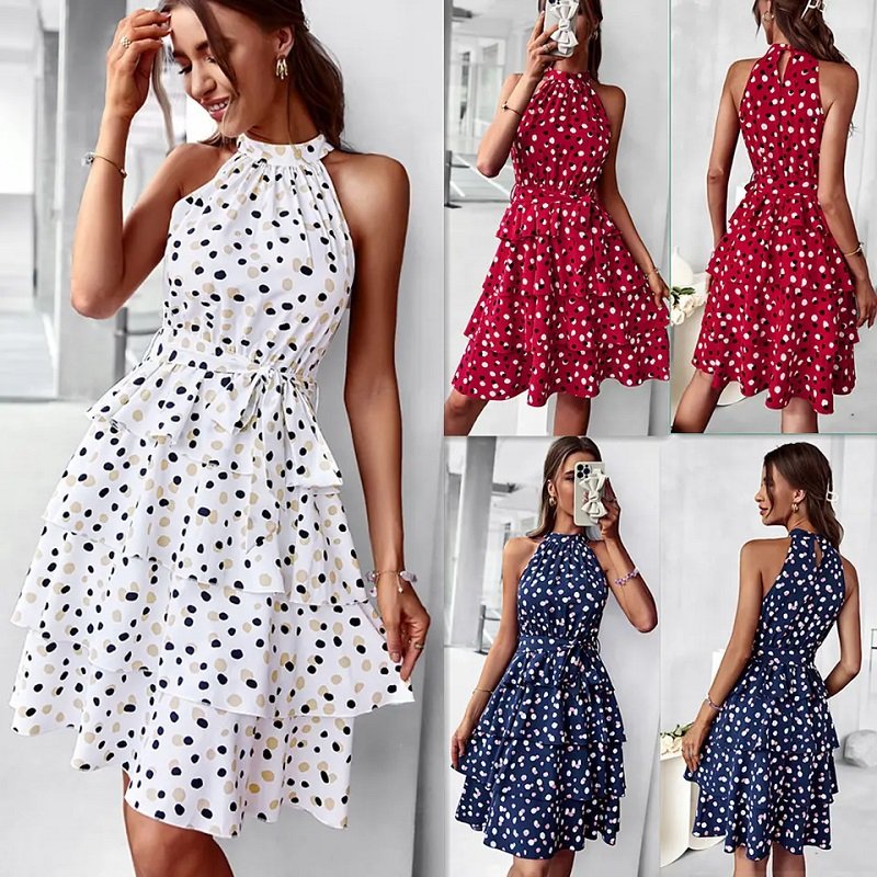 2023 summer Retro Hepburn Style Polka Dot Print Waist Slim Casual Sleeveless Swing Dress for women and girls, White Dress.