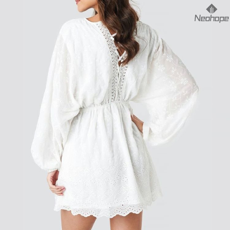 WHITE RUFFLE DRESS SUPPLIERS OEM CUSTOMIZED MANUFACTURERS OF FASHION HOT SALE LOOSE FIT LONG SLEEVES EMBROIDERY LACE RUFFLE HEM WITH ELASTIC WAIST WOMEN DRESS.