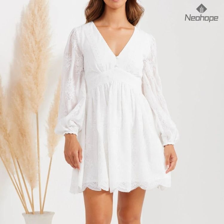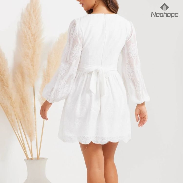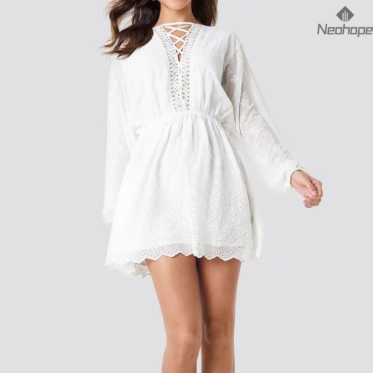 Manufacturing OEM /ODM Hot Selling White Ruffle Dress Suppliers & Hot Sale Loose Fit Long Sleeve Embroidery Lace Ruffle Hem With Elastic Waist Women Dress