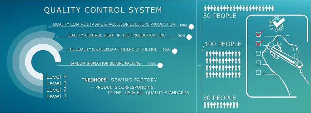 50 quality control inspectors and 30 re-checkers in our production. Welcome to Visit us Neohope Always Welcome our Worldwide Customers for Small and Middle Sized Orders.